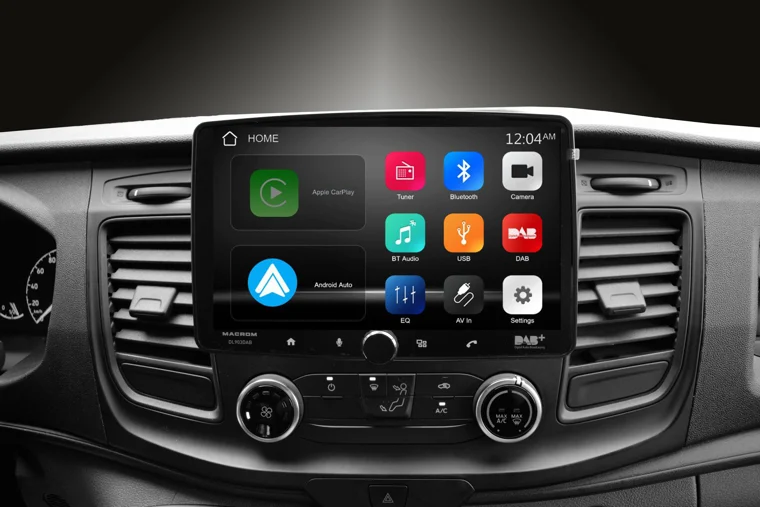 DL903DAB.KITFOTRA MACROM - Monitor DL903DAB 9" kapazitiv ASPORTABILE, 1DIN Gehäuse + KIT03FOTRA: Halterungen, Plug & Play Verkabelung und CAN-BUS Lenkradsteuerungs-Schnittstelle, kompatibel mit Ford Transit ab 2019.