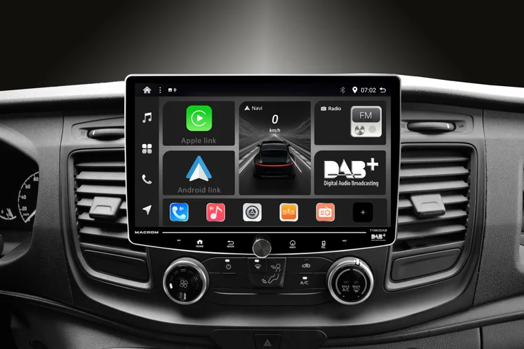 T1003DAB.KITFOTRA MACROM - Monitor T1003DAB Android 13, 10'' (1920x1080) QLED kapazitiv mit 1 DIN Gehäuse + KIT03FOTRA: Halterungen, Plug & Play Verkabelung und CAN-BUS Lenkradsteuerinterface, kompatibel mit Ford Transit ab 2019.