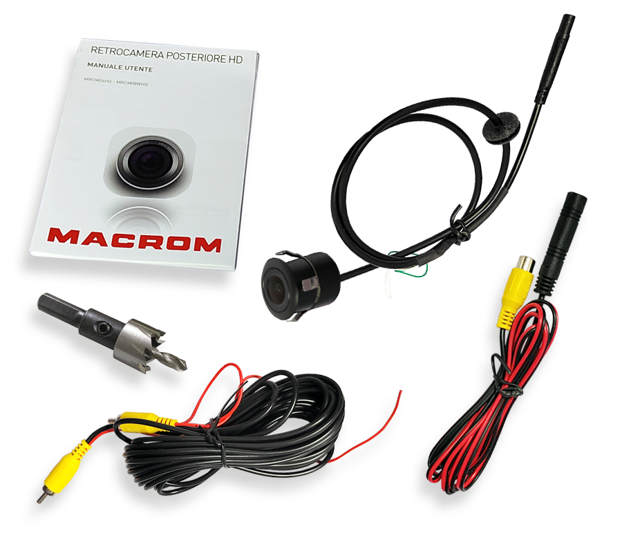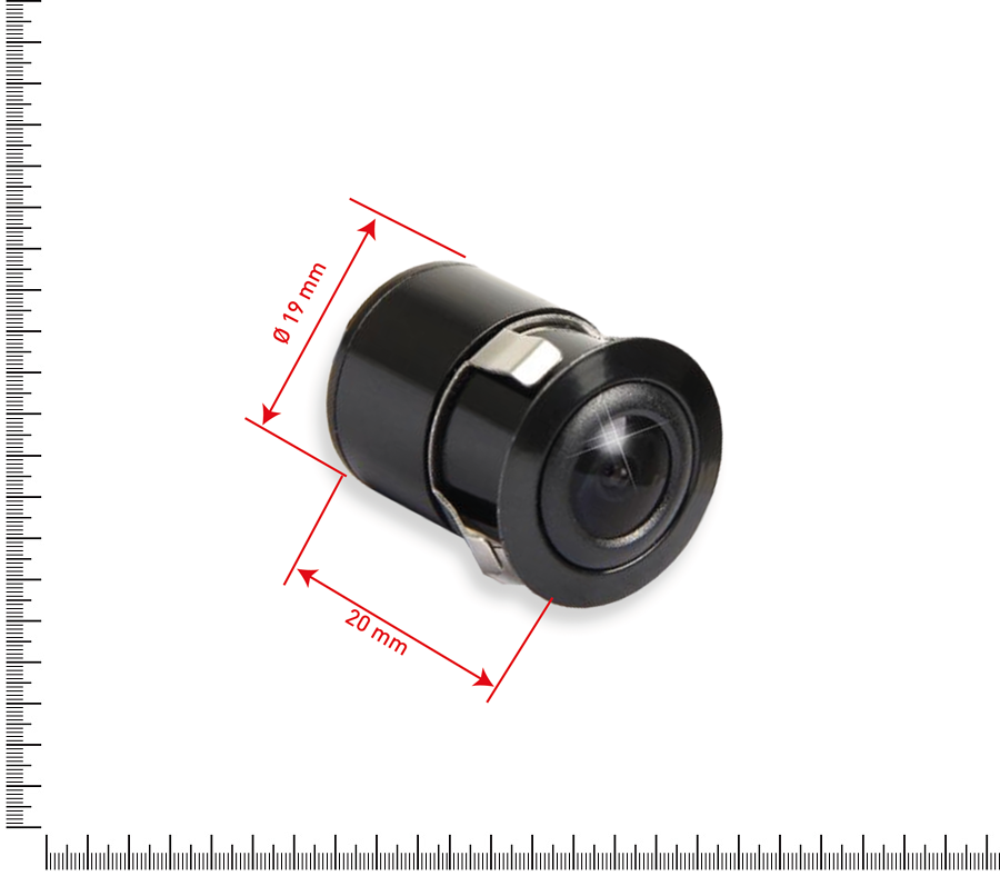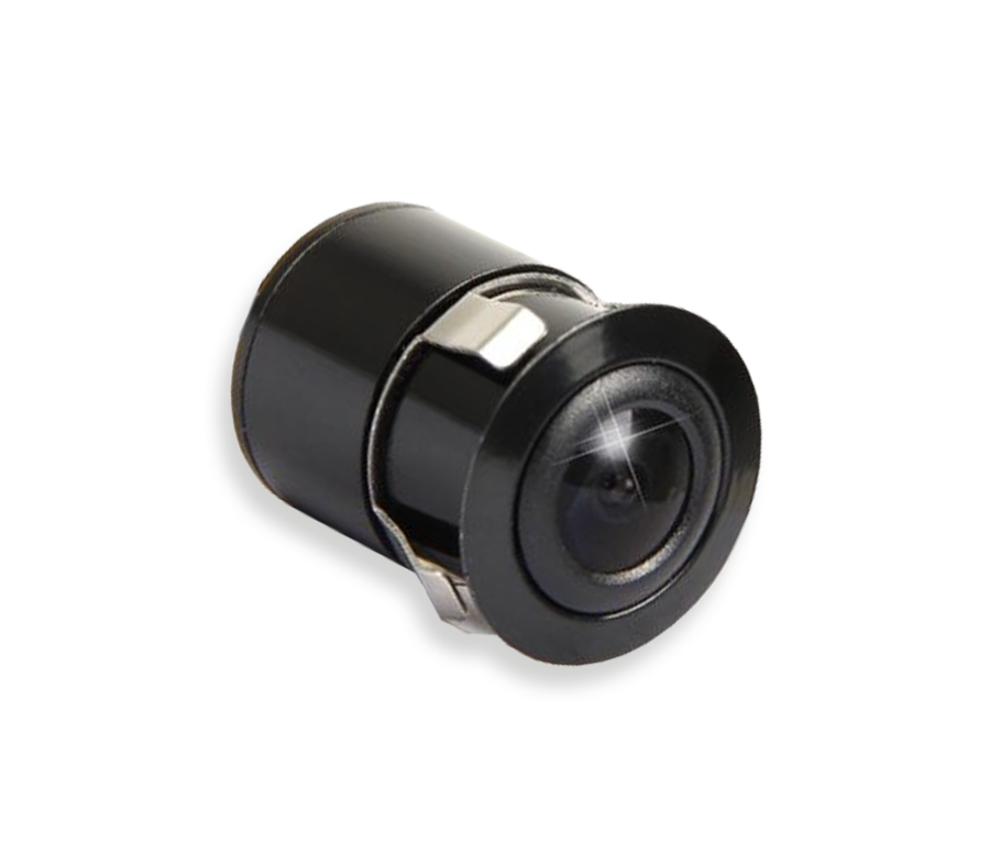 Flush-mount cylinder reversing camera, CMOS 1/4", 968x488 pixels, IP68, 170° view, mirror option, parking guidelines, easy to install.