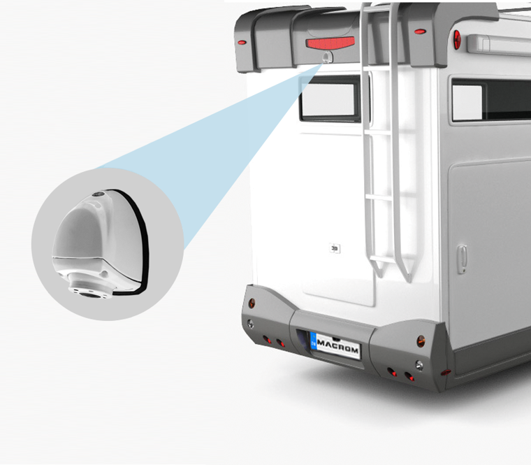 Cámara trasera universal para camper con visión nocturna, óptica ajustable 360° y gran ángulo de visión para maniobras seguras.