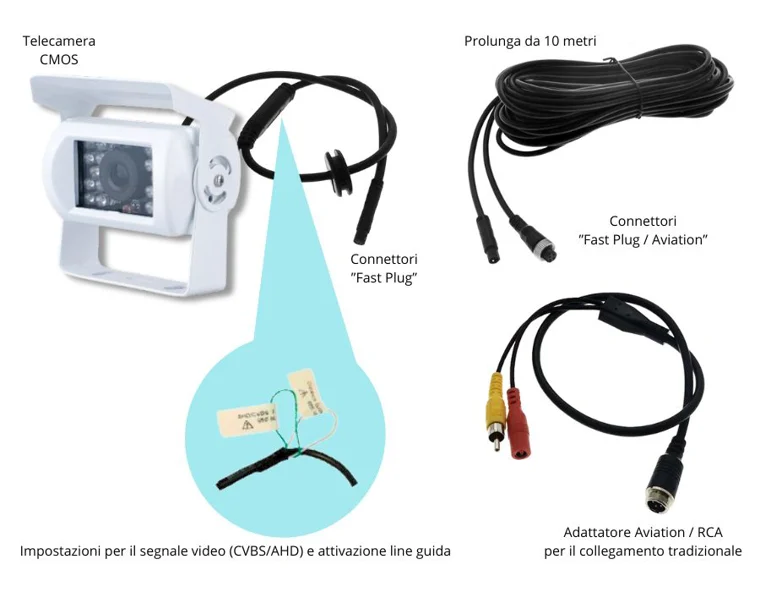 Retrocámara universal para autocaravanas con visión nocturna por infrarrojos, CMOS 1/3", IP68, ángulo 120°, ajuste de altura y cable de vídeo de 10 metros para instalación flexible.