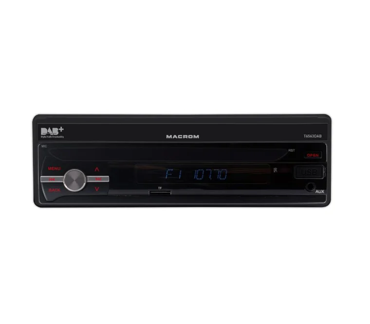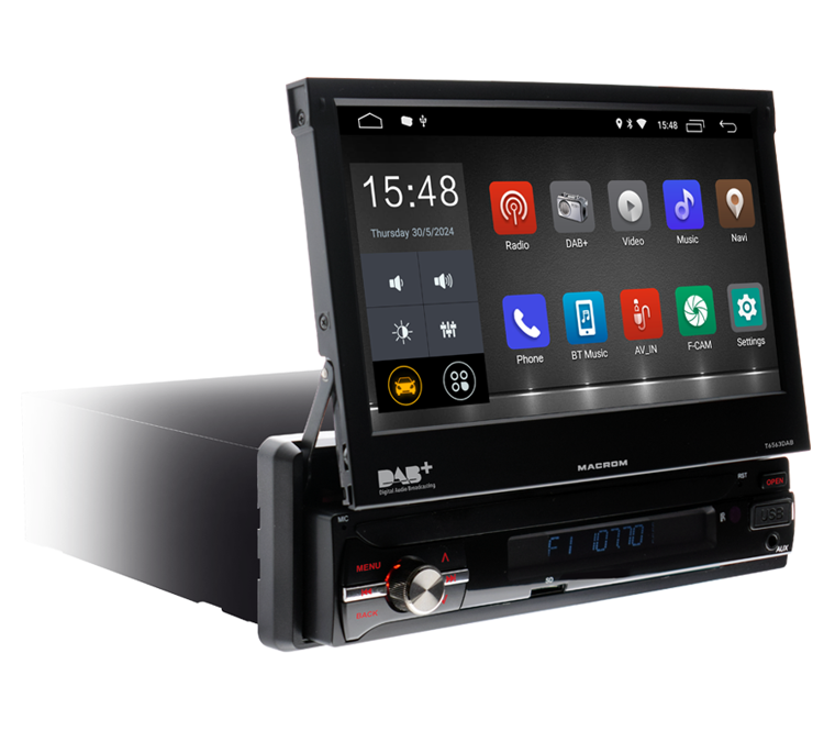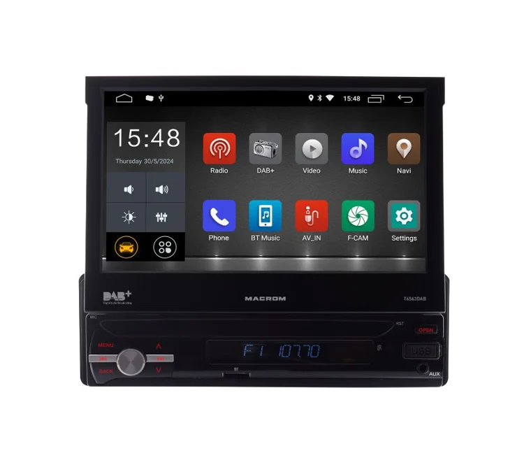 Monitor Android 7” motorizado 1 DIN con receptor DAB – perfecto para un infoentretenimiento avanzado y radio digital de alta calidad.