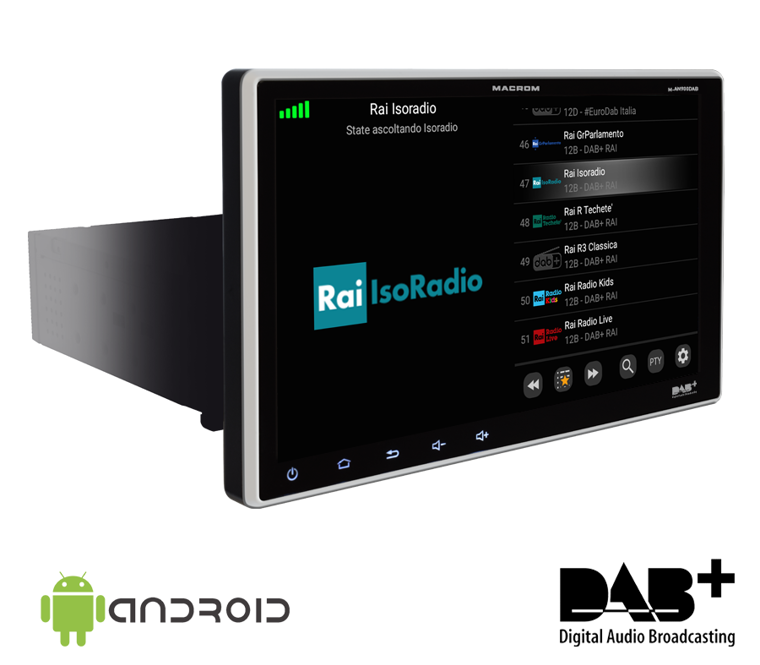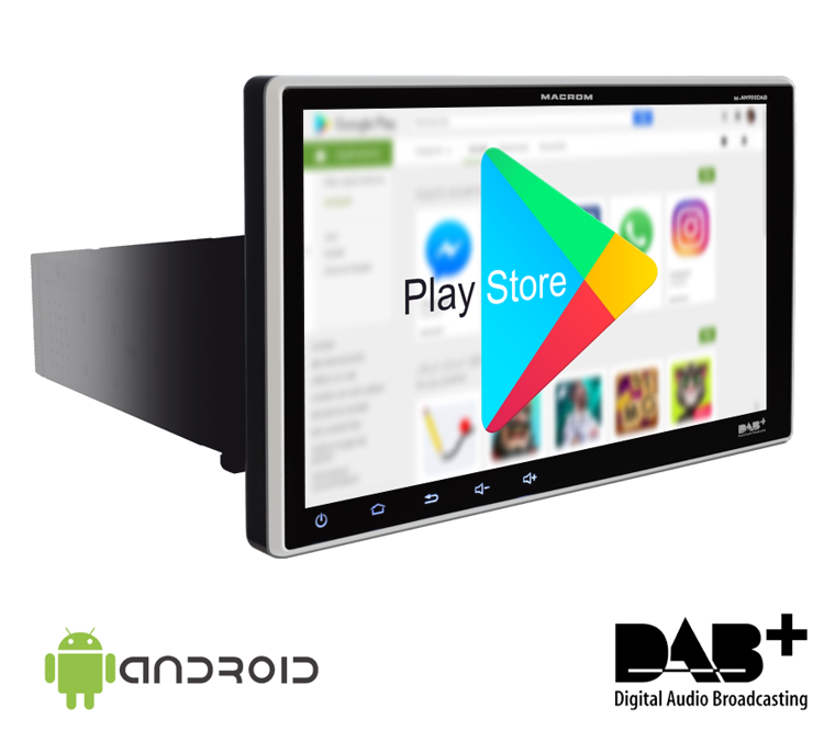 Moniteur Android 9” 1 DIN avec récepteur DAB, écran inclinable et applications connectées pour un système d’infotainment complet.