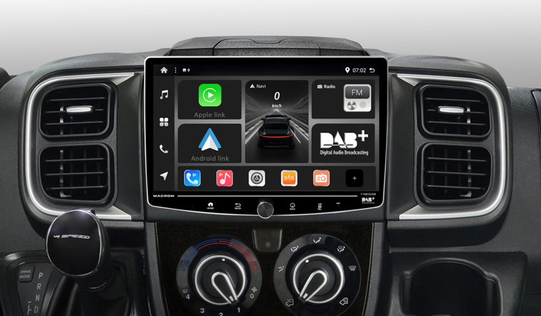 Système multimédia Android 13 1DIN avec écran QLED 10’’, radio DAB+, Bluetooth 5.0 et kit Plug & Play pour FIAT Ducato dès 2021.