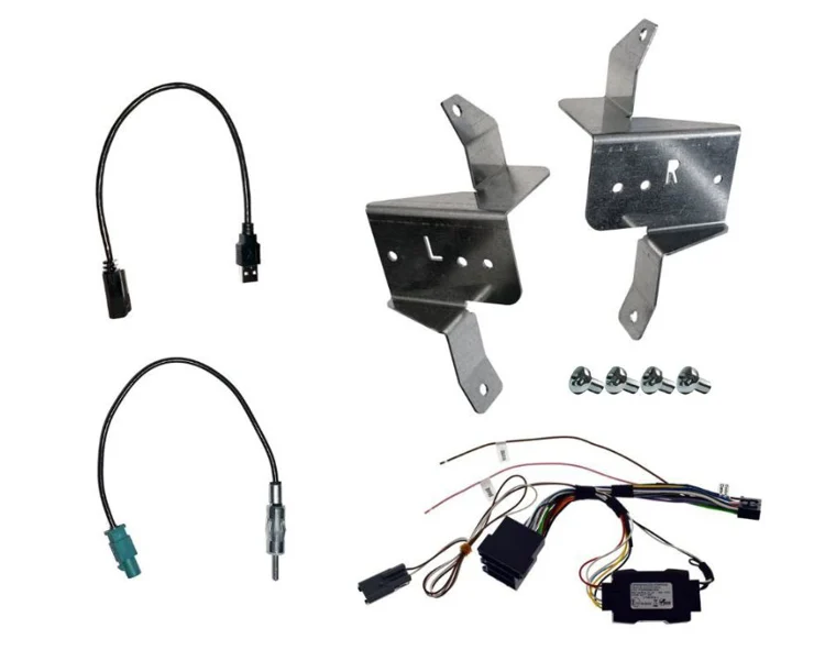 T1003DAB.KITFOTRA MACROM - Moniteur T1003DAB Android 13, écran capacitif QLED 10' (1920x1080) et corps 1 DIN + KIT03FOTRA : supports, câblage plug & play et interface de commande au volant CAN-BUS, compatible avec Ford Transit à partir de 2019.