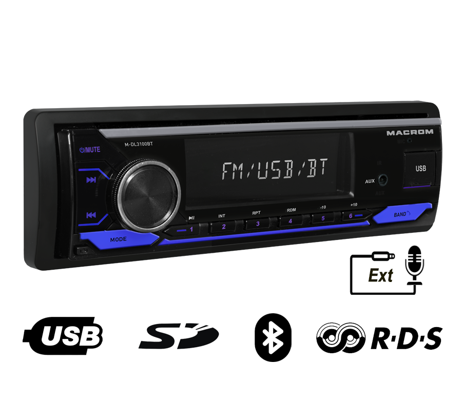 Sintolettore 1 DIN AM/FM-RDS con Bluetooth, USB, SD e vivavoce, per un’esperienza audio completa e connessa in auto.