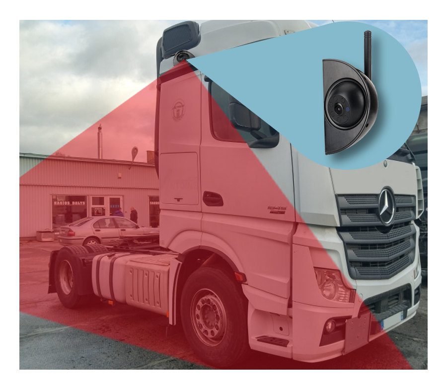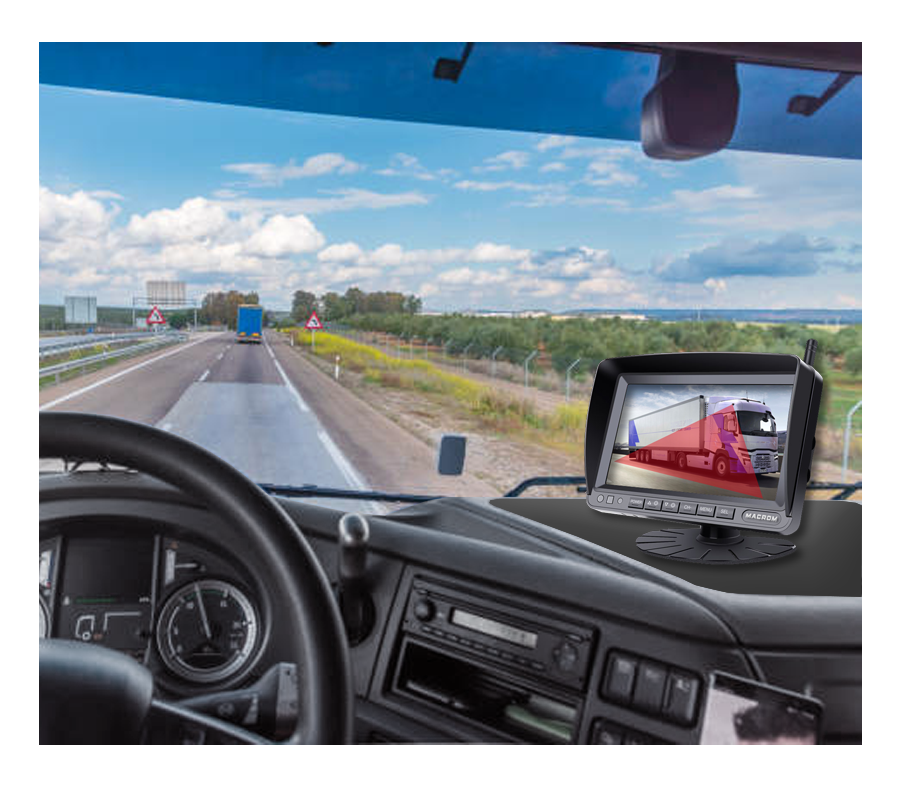 Kit monitor 7” AHD IPS con telecamera laterale wireless, visione notturna IP68, registrazione QUAD Vision e connessione Wi-Fi fino a 200 metri per sicurezza e visibilità laterale.